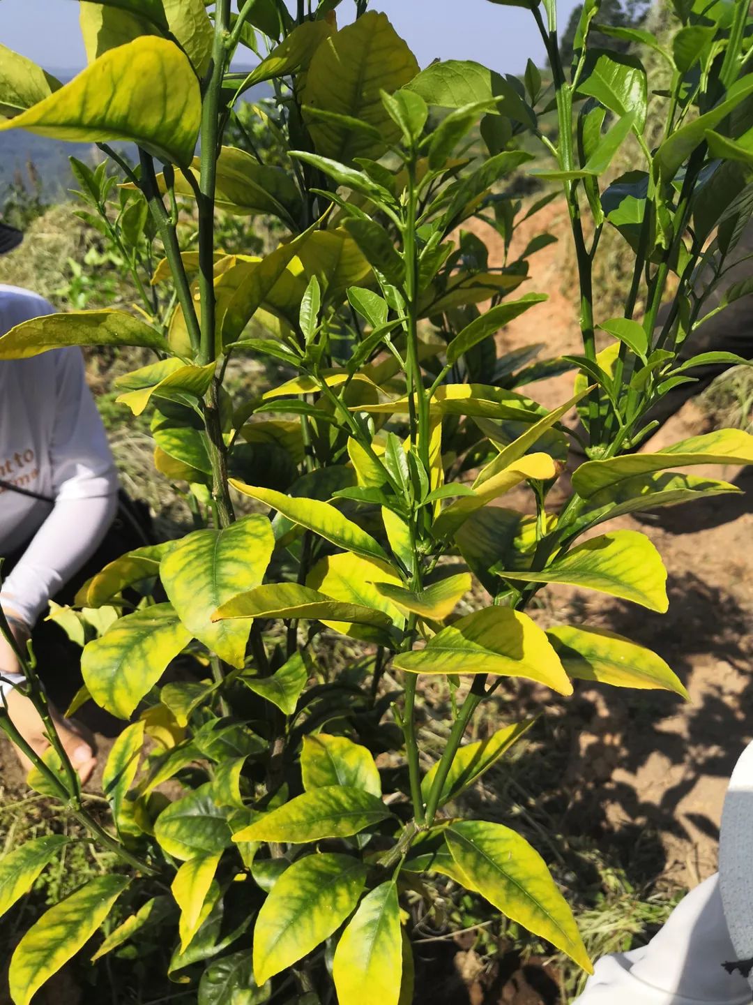 案例一: 某柑橘基地在施用底肥时采用的营养方案为有机肥10公斤+复合肥300克+钙镁磷500克+中微量元素肥100克(每株用量),埋施底肥一个月后出现植株叶片发黄脱落。